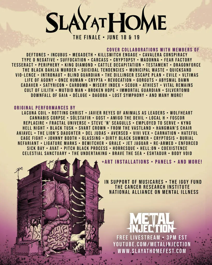 As for the music, the line up for the Slay At Home Finale boast a who's who in heavy music. The complete line up of collaboration participants includes members of Deftones, Megadeth, Incubus, Killswitch Engage, Cavalera Conspiracy, Type O Negative, Suffocation, Carcass, Cyrptopsy, Fear Factory, King Diamond, Dragonforce, Municipal Waste, Satyricon, SCOUR, Vital Remains and so, so many more.
