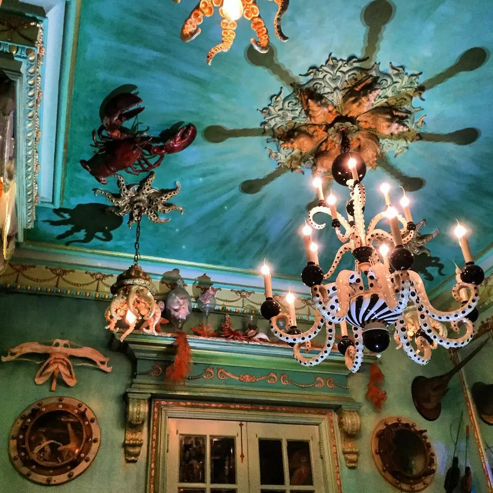 As for octopus chandeliers, Wallacavage recalls more than a few instances of deep-seeded inspiration. He remembers seeing an old Charlies Addams comic Wednesday Addams with an octopus on her bed. Something about that stuck. The artist further explained the inspiration he drew from a book from Ernst Haeckel called Art Forms In Nature. The book featured a glass jellyfish chandelier called the ‘Medusa' that was being showcased in a museum in Monaco. Wallacavage said that visual blew him away. From there, his vision was set.