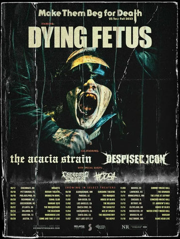 The announcement of the album also includes the confirmation of US headlining tour for Dying Fetus in support of the release. The 26-date stretch will see the band sharing selections from Make Them Beg for Death and will include a massive supporting roster with The Acacia Strain, Despised Icon, Creeping Death and Tactosa all joining the trek.