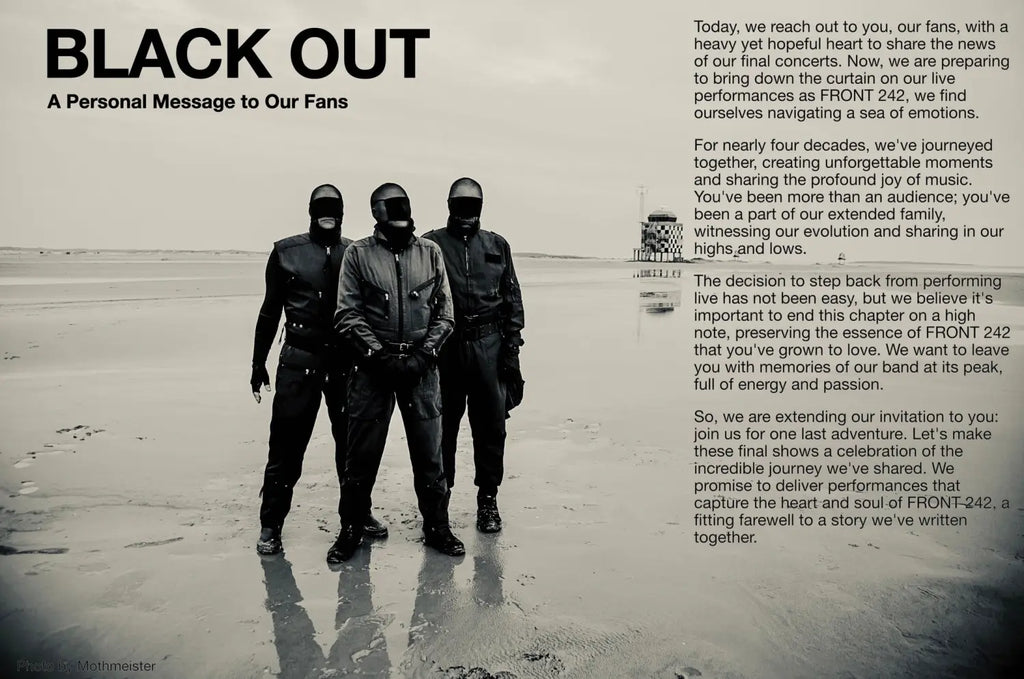 “It is with a heavy mix of emotion that we close this great adventure, some 40 years in the making,” shared Front 242's core Patrick, Richard and Lean Juc. “We realize that ending our journey at this time, when we are still vibrant and full of energy is how the band should be remembered. We are excited to share these meaningful final performances with our wonderful fans who have been with us through it all.”