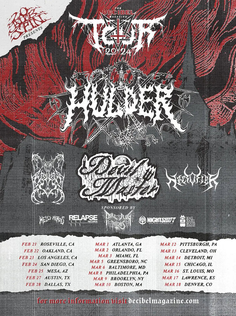 The band expresses their excitement in headlining the Decibel Tour, "It is an honor to be given the opportunity to headline the 2024 Decibel Tour. The band will be playing a strong setlist with a number of twists and turns throughout and I am looking forward to this new chapter in the journey of Hulder’s live performance. I can only imagine that being joined by our brothers in Devil Master, Worm, and Necrofier will be nothing but a display of power and force. We shall carry the torch of the old guard and blaze a pathway for the new era.”