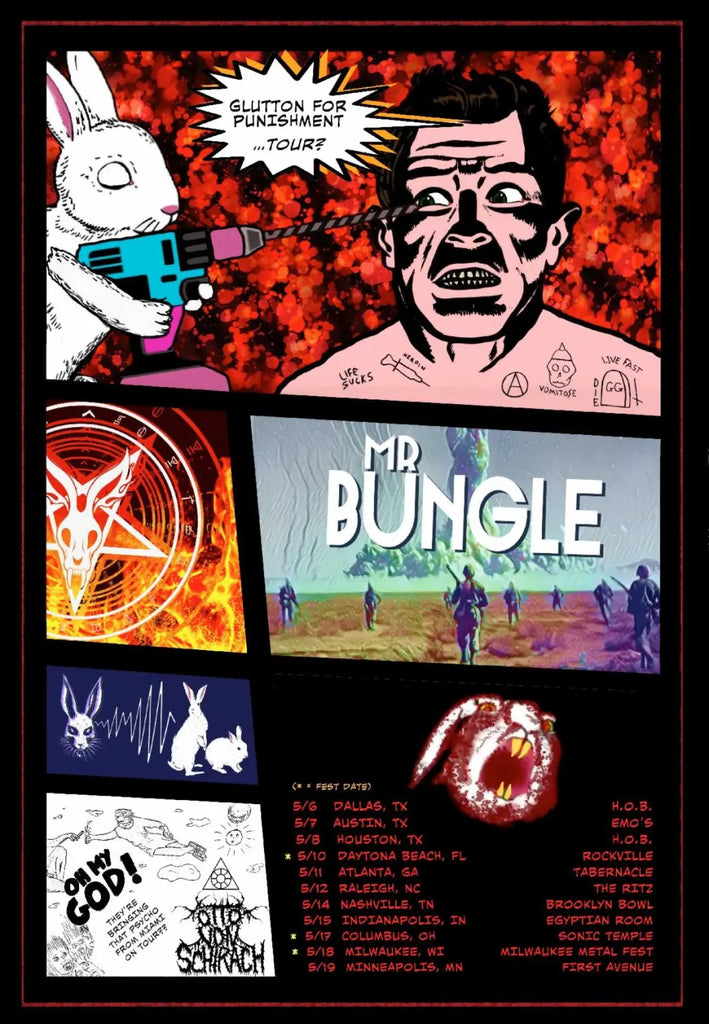 The tour begins with international dates starting February 28th in Tokyo, Japan, and includes performances across New Zealand, Australia, and Europe. Mr. Bungle's lineup for this tour will also feature appearances at several major festivals, including Welcome to Rockville in Daytona Beach, Sonic Temple in Columbus, Milwaukee Metal Fest, and the renowned Hellfest in Clisson, France.
