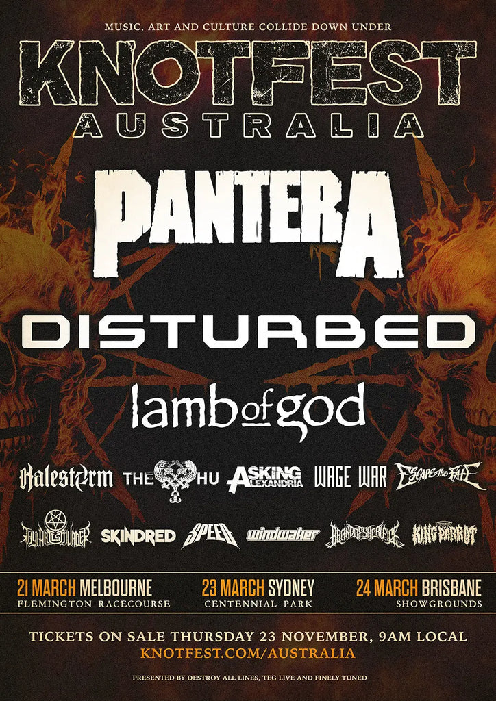 Emphasizing the collective culture and international community of heavy music, Knotfest Australia 2024 will broaden the focus of the festival with a legendary bill topped by heavyweights, Pantera, Disturbed and Lamb of God.