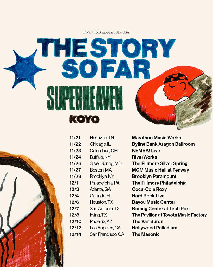 Setting dates and cities for the I Want to Disappear 2024 Tour, The Story So Far has enlisted Superheaven and Koyo for the duration of the run. The band will be showcasing selections from the celebrated album produced by Jon Markson - propelled by the album's anthems,"Big Blind", "Letterman" and "All This Time".