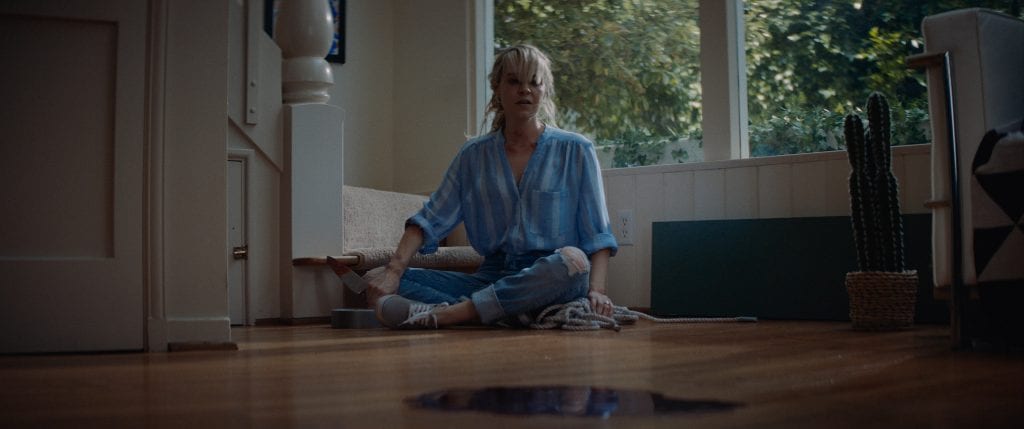 Lucky blends elements of home invasion and psychological thrillers, slashers, and time loop movies to create a rather poignant and darkly humorous satire, one whose social commentary is obvious but never heavy-handed. The film calls to mind Steven Soderbergh’s Unsane or Leigh Whanell’s The Invisible Man in the ways May is continuously gaslit and dismissed by authority figures, friends, and her partner to the point that she questions herself and her own sanity. While she initially learns how to better defend herself and deal with the murderous man more easily, the fact that her nightly battles are seemingly never going to end start to take its toll. Dark circles form under May’s eyes, she becomes far more paranoid, and both her personal and work life begin to crumble as she struggles to keep it together.