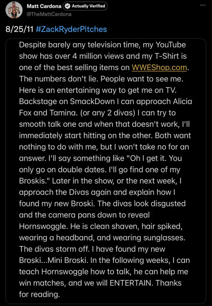 Matt Cardona, the former Zack Ryder in WWE, has been in the gossip pages as somebody WWE might be looking to bring back. WWE has signed his wife, Chelsea Green, and there were rumors of a new reality show for E! focusing on couples in the company, and Green and Cardona have been approached as one of the couples. To cash in on the publicity, Cardona has been sharing old pitches he would send to WWE creative, to try to be featured on television. This pitch in particular stands out as something very very WWE:
