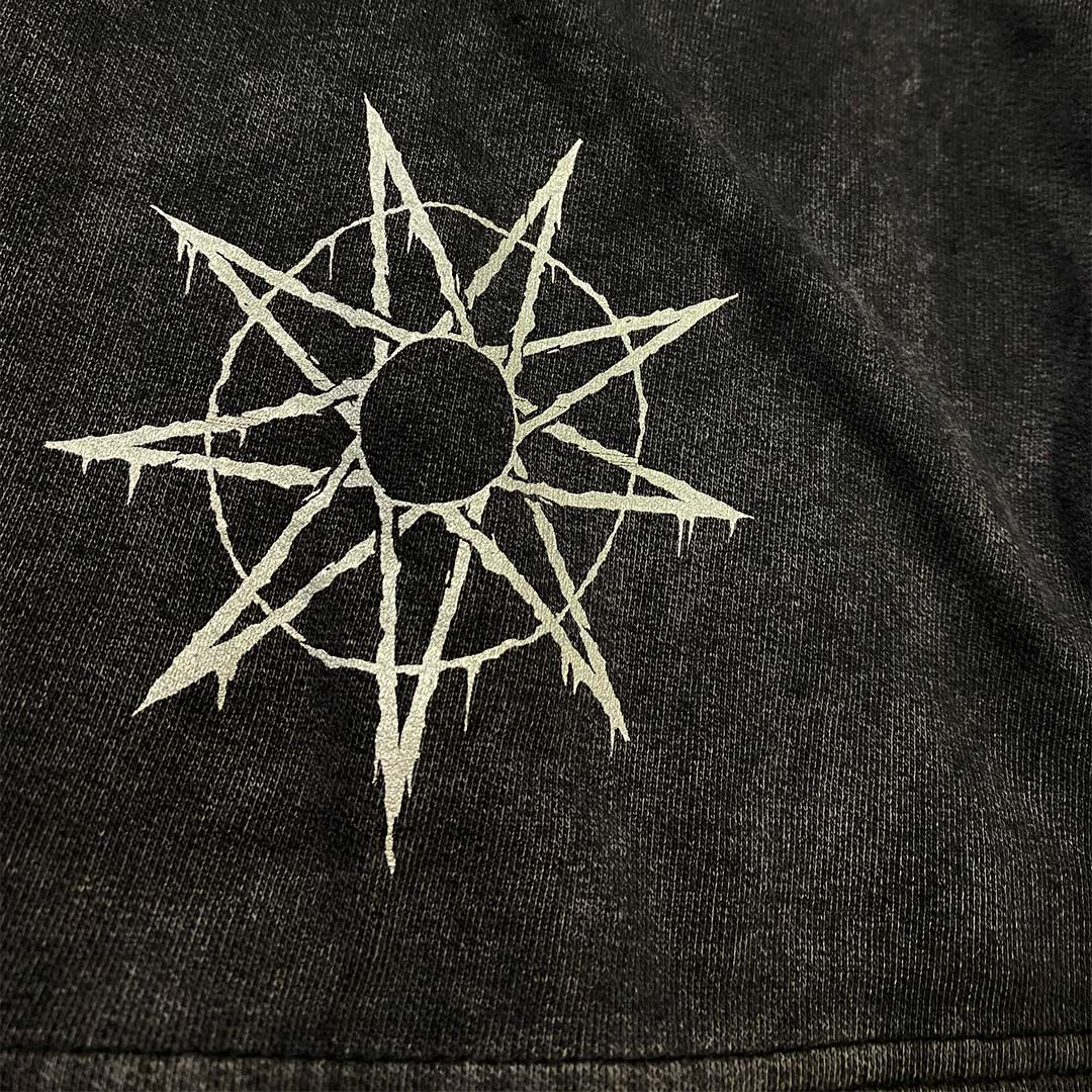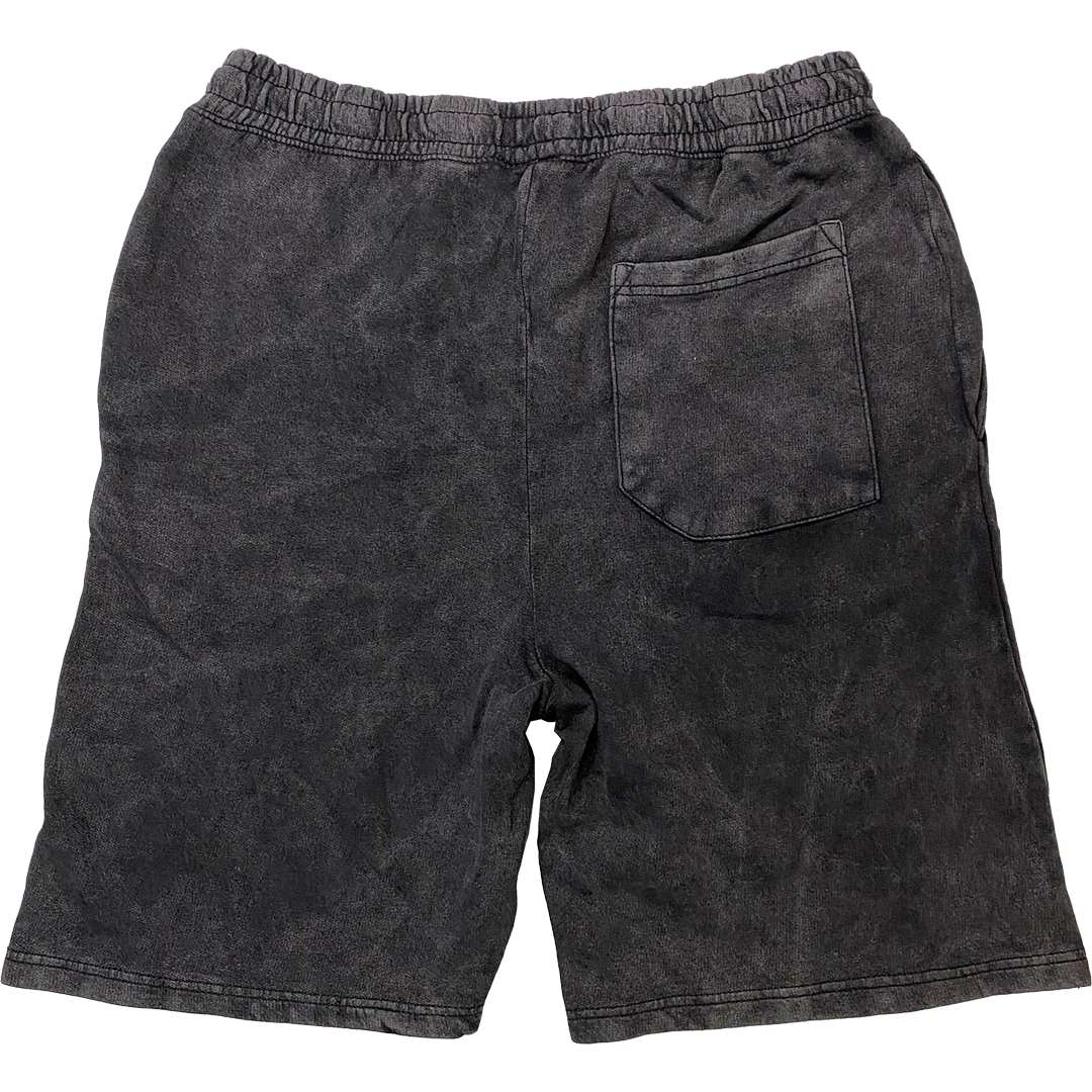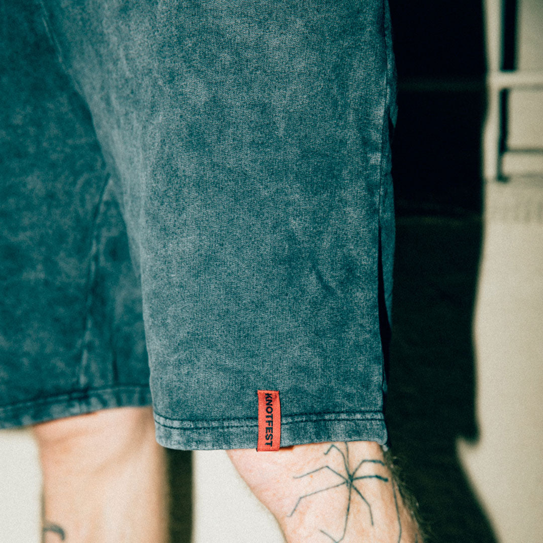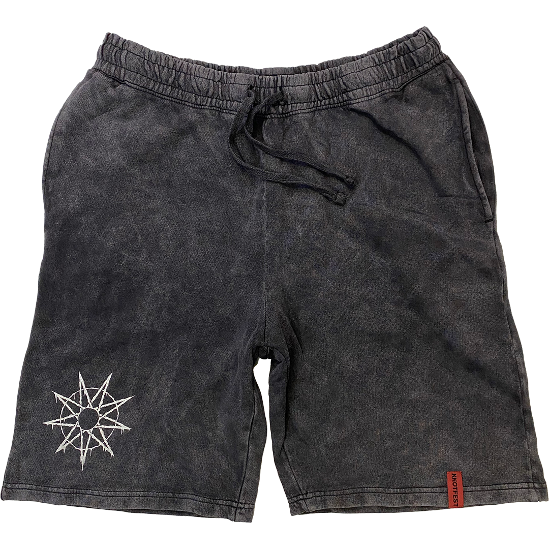A pair of drawstring unisex 100% cotton shorts in a black vintage wash featuring "Nine" graphic printed on the right leg. It also features a custom Knotfest tag.