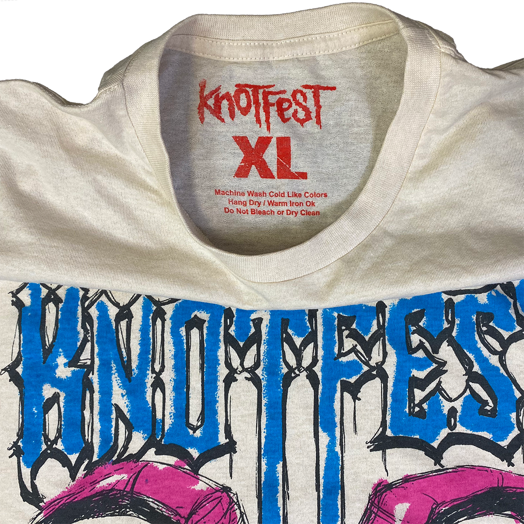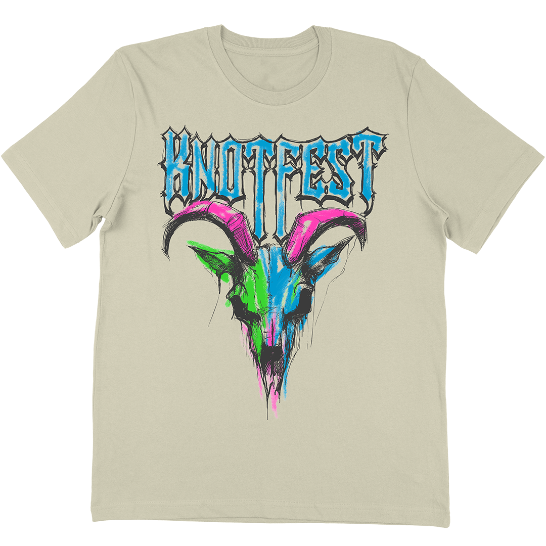 A unisex crewneck t-shirt in vintage white with Knotfest "Pencil Sketch Goat" graphic printed on the front.